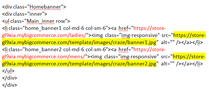 <div class="Homebanner"> <div class="inner"> <ul class="Main_inner row"> <li class="home_banner1 col-md-6 col-sm-6"><a href="%%GLOBAL_ShopPath%%/ladies/"><img class="img-responsive" src="%%GLOBAL_ShopPath%%/template/images/craze/banner1.jpg" alt="" /></a></li> <li class="home_banner2 col-md-6 col-sm-6"><a href="%%GLOBAL_ShopPath%%/mens/"><img class="img-responsive" src="%%GLOBAL_ShopPath%%/template/images/craze/banner2.jpg" alt="" /></a></li> </ul> </div> </div>